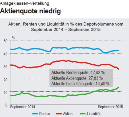 Die Aktienquote ist gegenüber der Vorwoche kräftig gefallen, die Liquidität hat ebenso kräftig zugenommen. Das dürfte aber größtenteils auf den Ausschnitt der erfassten Depots zurückzu-führen sein. Denn die wenigen Abgaben bei Aktien (bei Kaufüberhang) oder Kursveränderungen in der Berichtswoche können diese Sprünge nicht erklären. Dafür spricht auch, dass die sich meist gegenzyklisch zu Aktien bewegenden „Rentenquoten“ und die Anteile der „Sonstigen“ konstant geblieben sind.