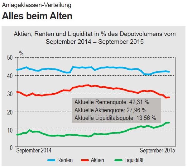 Die Zinsentscheidung der Fed ließ „alles beim Alten“ – nur die ungeduldigen Hoffnungen vieler Marktteilnehmer nicht – dementsprechend dürfte sich an der Verteilungsstruktur der Assetklassen in den kommenden Wochen nicht allzu viel ändern. Dabei kommt es natürlich auch auf die schwer abschätzbare Entwicklung der Aktienmärkte und die taktischen Gewichtungen an; noch stärker aber können sich gegebenenfalls Veränderungen der Grundgesamtheit der Depots in den Quoten niederschlagen.