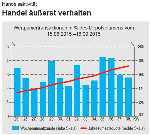 Nachdem in der Vorwoche gerade einmal drei Prozent des gemeldeten Depotgesamtvolumens umgesetzt wurden, waren es in der hier zu besprechenden Berichtswoche noch weniger, nämlich 2,78%, bei einem ähnlich geringen Umsatzvolumen von 8,3 Mio. Euro. Man wartete offenbar partiell zunächst die Notenbankentscheidung ab, denn am Freitag, 18. 9., wurde überproportional häufiggehandelt. Erstmals seit Langem registrierten wir sowohl bei Anleihen wie auch bei Fonds keine Käufe.