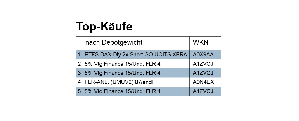 In den Top Ten bei den Käufen per Umsatzvolumen sind 9 Transaktionen von Unternehmensanleihen und ein ETF-Investment (auf Platz 9) gelistet. Letzteres war das einzige Fonds-Investment in der Berichtswoche. Da es von einer Vermögensverwaltung mit kleinerem Depot getätigt wurde, belegte es im Ranking der depotbezogenen Kaufanteile Platz 1. Es handelte sich um einen Short-ETF auf den Dax (A0X9AA). Der wurde in den letzten Wochen in der Erwartung, von fallenden Kursen kurzfristig profitieren zu können, schon häufiger gehandelt. In der Vorwoche z.B. führte er die firstfive-Tabelle der Verkäufe gemäß Depotgewicht an.