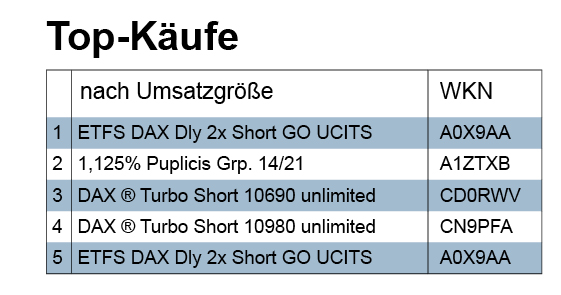 Ganz oben in der firstfive-Liste der Topkäufe gemäß Kaufvolumen wie auch an der fünften Position dieser Tabelle stehen Transaktionen mit einem ETF auf den Dax. Und an dritter und vierter Position stehen Käufe mit Turbo-Short-Zertifikaten.