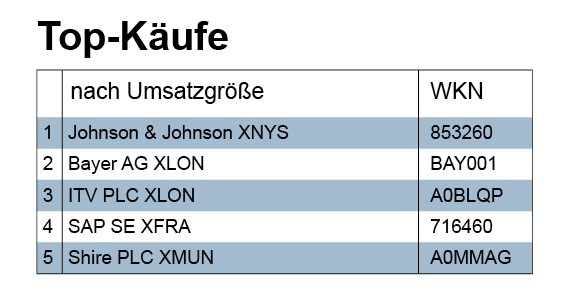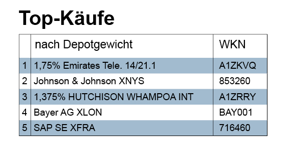 Im Aktienbereich hielten sich die Verwalter bei Emerging Market Aktien deutlich zurück. Wir sahen in der vergangenen Woche keinen klar dem Schwellenland-Bereich zuordnenbaren Aktienkauf. Meist kauften (und verkauften) die Verwalter Einzeltitel aus Deutschland, Europa und den USA. In Bezug auf Deutschland sahen wir Erste-Reihe-Titel von Daimler über Henkel, Infineon, Munic Re bis zur schon erwähnten SAP. Aus den USA fiel insbesondere Johnson und Johnson auf, die gleich von mehreren Verwaltern geordert wurde.