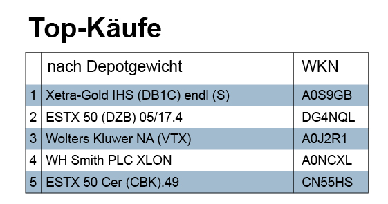 Kommen wir von der Geldpolitik der Notenbanker zur „Goldpolitik“ der von uns erfassten Verwaltungen und damit zu unseren Topkäufen. Denn ganz oben auf der Rangliste nach Depotanteil steht ein Gold-Kauf in Gestalt des Xetra-Gold IHS (A0S9GB). Gefolgt wird er von einem Discount-Zertifikat auf den Euro-Stoxx-50 (DG4NQL). Und auf dem fünften Rang dieser relativen Top-Liste steht ein Knock-Out-Produkt auf den Euro-Stoxx 50 (CN55HS).
