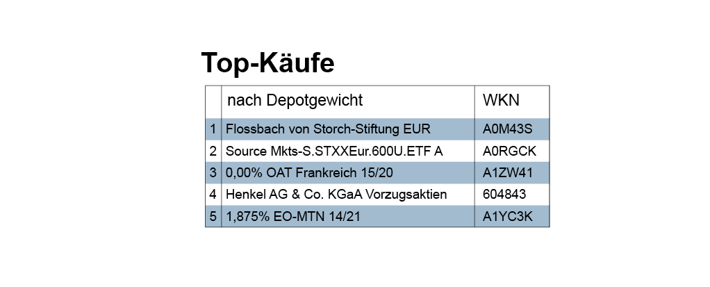 Das Kaufvolumen belief sich in der Berichtswoche auf 22,4 Mio. Euro, davon entfielen auf Fonds knapp 13 Mio. Euro und auf Anleihen nicht ganz 8,9 Mio. Euro. Für Aktien blieb dann nicht allzu viel mehr übrig. Dennoch wollen wir an dieser Stelle zunächst die first five bei den Aktien aufzählen: Henkel; ams; VISA; Oréal; Sodexo. Betrachtet man alle Käufe bei Aktien, dann wurden bekannte Titel aus dem für das Gesamtdepot typischen Aktienuniversum gewählt. Man riskierte also in der Berichtswoche bei der relativ geringen Kaufsumme mit Aktien größtenteils praktisch nichts und ging auch keine Experimente ein.