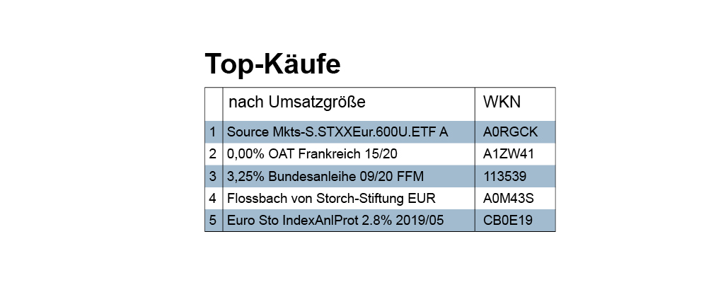 Von den Festverzinslichen konnten sich zwei Staatsanleihen ins Ranking der Top-Käufe schieben: eine französische und deutsche. Beide Wertpapiere zusammen machten bereits über 80 Prozent der Investitionen in Anleihen aus. Verantwortlich zeichnete eine Verwaltung mit großem Depot. Die fünfjährige französische Nullkuponanleihe (A1ZW41), deren Kurs seit Juni letzten Jahres von unter 98 Euro auf aktuell 100,78 geklettert ist, läuft bis 2020 und rentiert gerade mal mit –0,168%. Die Rendite der am 13.11. 2009 emittierten, bis 2020 laufenden Bundesanleihe (113539) beträgt aktuell 0,000%.