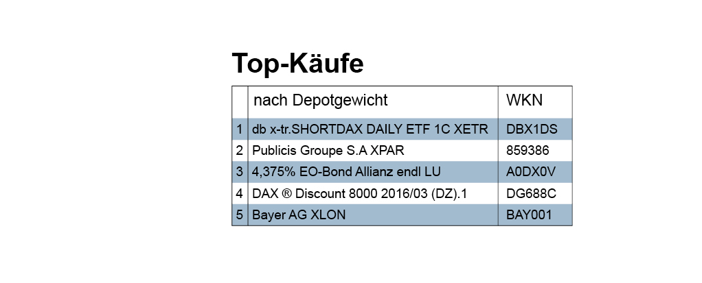 Käufe im Fondssegment fielen beinahe ganz aus. In eine Long-Strategie wollte offenbar niemand investieren. Dagegen schaffte es – bei fallenden Kursen nicht ganz überraschend – ein Short-ETF auf den DAX (DBX1DS) in die Liste der Topkäufe: „Das Anlageziel besteht darin, die Wertentwicklung des ShortDAX® Index abzubilden, der die umgekehrte Wertentwicklung des DAX® Index zuzüglich eines Zinssatzes widerspiegelt.“ Zwar trifft man in den letzten Monaten im Umfeld fallender Kurse immer wieder auf Short-ETFs, sie werden aber bisher dennoch nur recht sparsam von den Verwaltungen eingesetzt.