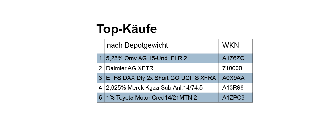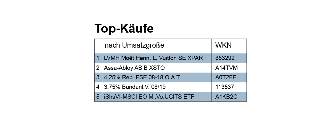 Bei den von uns erfassten Käufen übertraf das Volumen der Bond-Transaktionen mit 6,62 Mio. Euro den Kaufumsatz der Aktien im Wert von 4,16 Mio. Euro deutlich. Ganz oben im Ranking der Top-Käufe der Berichtswoche gemäß Umsatzvolumen sind zwar zwei Aktien positioniert, aber auf den Plätzen 3, 4, 6 und 7 stehen Staatsanleihen Frankreichs (3,7) und Deutschlands (4,6).