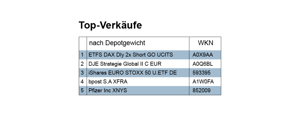 Beginnen wir mal zur Abwechslung mit den „unsichtbaren“ second five der top ten bei den Verkäufen gemäß Depotgewicht: Dann finden wir dort nur Aktien: Fortum (6), Zurich Insurance Group (7), Merck (8), BASF (9) und Schneider Electric (10). Die first five dieser Liste werden von drei Fonds angeführt. Von denen gehörte die erstplatzierte ETF-Shortstrategie wie auch die drittplatzierte Longstrategie zu den Verlieren der Woche, der zweitplatzierte Mischfonds – der den Begriff „Strategie“ wie ein Versprechen auch im Namen führt – hingegen zu den Gewinnern.
