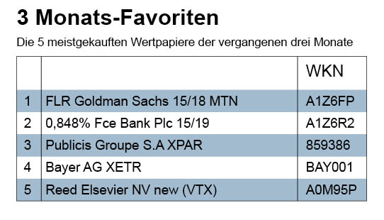 Im Dreimonatsbereich konnte eine Finanzanleihe von Goldman Sachs auf Anhieb den ersten Platz in der Wertung erobern. Die variabel verzinste Anleihe zahlt derzeit einen Zins von 0,531 Prozent bezogen auf den Nominalwert aus. Sie läuft noch drei Jahre. Wohl kein Zufall, dass eine variabel verzinste Anleihe zum Favorit der Verwalter geworden ist. Die FED hat schließlich nach Ansicht vieler Beobachter auf ihrer letzten Sitzung die Zinswende eingeleitet.