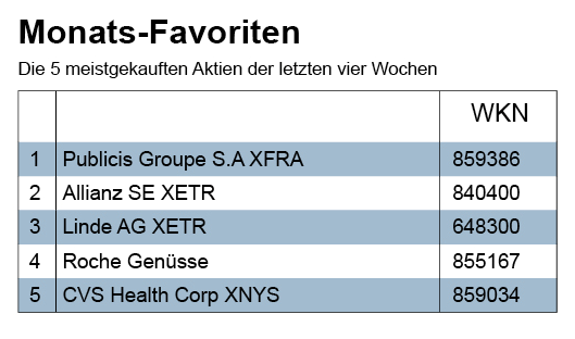 Im Aktienbereich machten die Käufe etwa Zweidrittel aller Transaktionen aus. Hier wurde eine breite Palette an Aktien von Unternehmen geordert, die entweder aus Deutschland (Bayer, BASF, Krones, Linde etc.) stammen oder die Inhaber sehr großer internationaler Marken (Microsoft, Apple, Amazon, Nestlé etc.) sind.