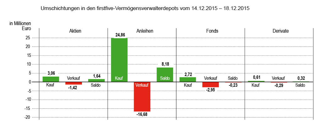 Der in der Berichtswoche stark dominante Anleihenbereich mit einem Umsatz von mehr als 41 Millionen Euro rührt insbesondere aus Aufträgen, die eine alpenländische Adresse gab. Hier gab es Eindeckungen mit Corporates und einigen südeuropäischen Staatsanleihen. Insgesamt überwogen die Käufe die Verkäufe um mehr als acht Millionen Euro.