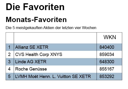 In der Betrachtung über die vier Produktarten Aktien, Anleihen, Fonds und Derivate hinweg lag das Augenmerk von Käufern und Verkäufern klar auf den Aktien. Mehr als drei Viertel aller Umsätze bezogen sich auf diese Produktkategorie. Die Entscheider verkauften dabei für 1,1 Millionen Euro mehr Aktien als sie umgekehrt einkauften. Gesucht waren insbesondere französische Werte und Aktien der zweiten Reihe wie Sodexo oder Essilor. Die Entscheider verkauften dafür bekannte Namen, etwa Linde, Vivendi oder Microsoft.