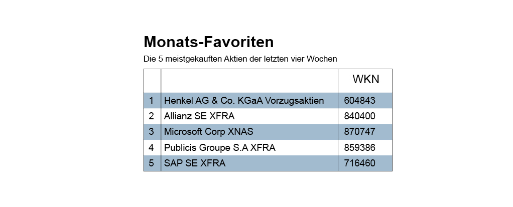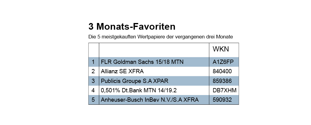 Die Anleihen von Goldman-Sachs (1. Platz), Deutsche Bank (3.) und FCE-Bank (nicht gelistet, aber gleichauf mit 5. Platz) verdanken ihre Positionen Käufen nur Mitte Dezember. Anders die Papiere von Allianz und Publicis Groupe, die auch im Januar gefragt waren. Gleiches gilt für die Aktien von Anheuser Busch InBev, die in der Berichtswoche ins Depot einer Vermögensverwaltung wanderten, die eigentlich in einer Äppelwoi-Region beheimatet ist. Der Kauf dürfte daher rein materiell motiviert sein, etwa weil der Großbrauer SABMiller, der bald von Anheuser Busch geschluckt wird, den Absatz im letzten Quartal 2015 um vier Prozent steigern konnte.