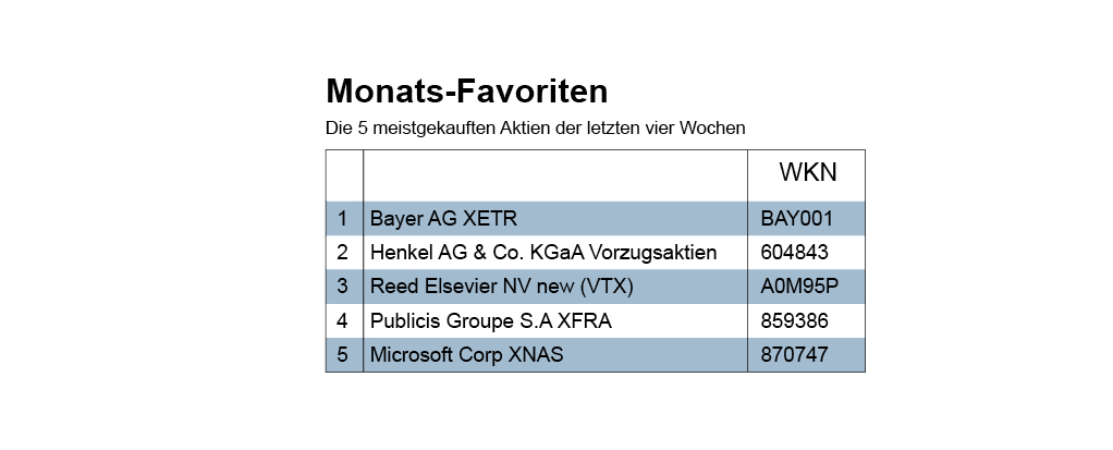 Der Unterschied zur Tabelle der Vierteljahresfavoriten in der Vorwoche besteht lediglich darin, dass die Aktie eines deutschen Industriegaseherstellers gegen die eines deutschen Pharmakonzerns ausgetauscht wurde: Linde fiel aus der Liste heraus, Bayer rutschte auch aufgrund der Käufe in der Berichtswoche rein. Deutscher Blue Chip wurde also gegen deutschen Blue Chip getauscht, so dass weiterhin zwei Dax-Werte im Favoritenranking positioniert sind. Wie lange noch?