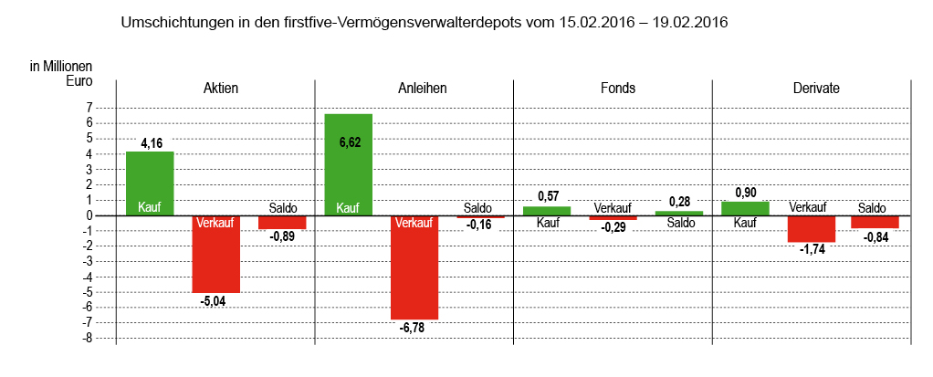 Bei den Aktienkäufen der Woche finden sich Werte quer durch die Branchen vor allem aus Europa. Das Kaufranking gemäß Volumen führten an: LVMH Moët Henn. L. Vuitton; Assa-Abloy AB (B); Ryanair; Deutsche Bank; Assicurazioni Generali. Auch Papiere von Daimler, Henkel und Disney fanden Käufer. Auf den Verkaufslisten stehen u.a. LVMH Moët Henn. L. Vuitton und Ryanair. Manche Verwalter kauften also, was andere verkauften. Bei den Festverzinslichen entfiel etwa die eine Hälfte der Käufe auf Unternehmens-, die andere Hälfte auf Staatsanleihen. Unter den Letzteren waren viele Fünfjährige mit unterschiedlicher Restlaufzeit (bis 18/19/20): deutsche und französische, mehr spanische und noch mehr italienische. Abgegeben wurden fast nur Unternehmensanleihen. Damit wurde Sicherheit eingekauft, Risiko verkauft. Beides kostet zur Zeit etwas.