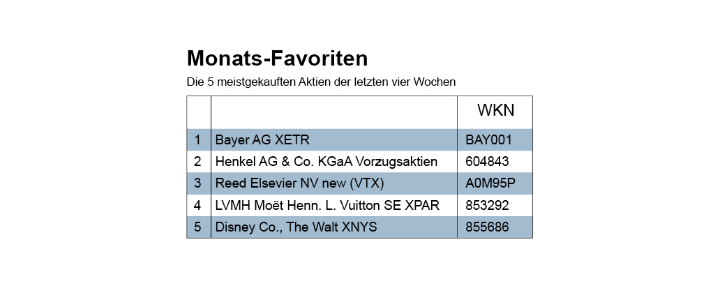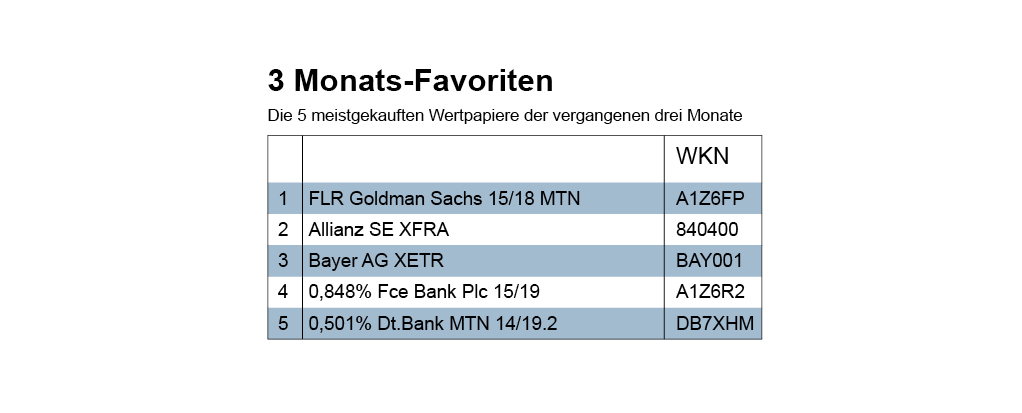 Wenig Bewegung bei den Drei-Monats-Favoriten. Weiterhin zwei Dax-Werte unter den frist five, wobei Allianz-Papiere in der Berichtswoche sogar gekauft wurden. Damit ist die Aktie das einzige Wertpapier, das aus unserem Favoritenkreis frisch in eines der uns gemeldeten Depots rückte. Immer noch dominieren in den top ten – und nun auch in den first five – Bankenanleihen. Das ist aber bloß ein Schatten der Vergangenheit. Die Mehrheit der Bankenanleihen wurde um den 16. Dezember 2015 herum gekauft. Einzig das erstplatzierte Papier von Goldmann Sachs war auch im Januar und Februar 2016 gefragt.