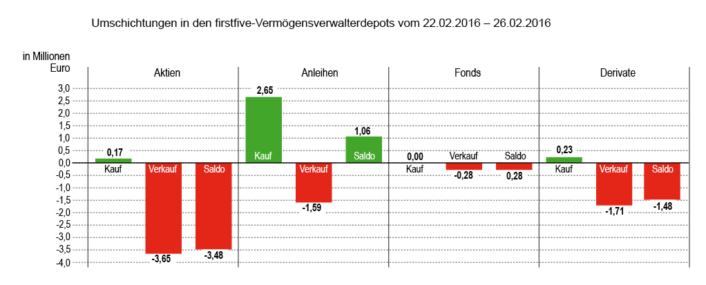 Die Verwalter nahmen in der Berichtswoche abermals mehr Sicherheit in Gestalt von Anleihen rein in die Depots und gaben höheres Risiko in Form von Aktien ab. Kaufseitig bestand der Kompromiss zwischen Sicherheit und Ertrag dann größtenteils darin, dass neben Staatsanleihen ungefähr in gleichem Umfang in Unternehmensanleihen (mit etwas höherer Rendite) investiert wurde. Bemerkenswert, dass beim Einkauf im Fondssegment kein Verwalter auch nur den kleinsten Finger rührte: Die Kaufsumme war infolgedessen gleich null. Es wanderten zwar einige Aktien in die Depots, darunter auch von Allianz. Aber das Volumen der Verkäufe war bei dieser Assetklasse mit 3,65 Mio. Euro deutlich höher als das der Käufe (0,72 Mio.). Aktien machten damit insgesamt rund die Hälfte des Verkaufsvolumens aus. Zertifikate und Anleihen waren für das Gros des Rests des Verkaufsumsatzes verantwortlich.