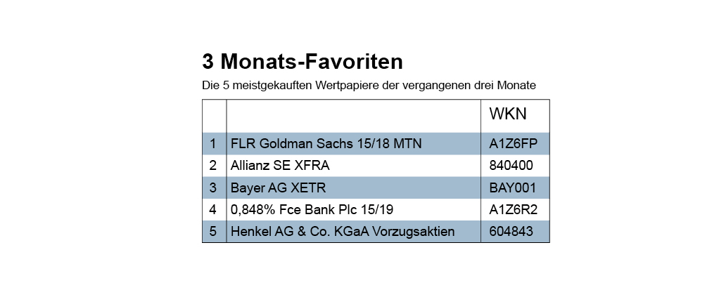 Die ersten Vier der Vierteljahresfavoriten haben sich in der Vergangenheit hartnäckig festgesetzt. Aber die Wette, dass in zwei Wochen die beiden Bank-Anleihen im Favoritenranking nicht mehr dabei sein werden, würde bei Buchmachern wohl kaum für Quote sorgen. Anders bei Allianz oder Bayer, die sich möglicherweise länger werden halten können. Unter den nicht gelisteten Favoriten, die sich aber im Kandidatenstand unterhalb der Schwelle zu den first five befinden, sind derzeit nur Aktien. Dazu zählen aktuell: Anheuser-Busch, LVMH Moët Henn. L. Vuitton, Relx – alles aktuelle Monats-Favoriten – und nicht zu vergessen: Henkel.