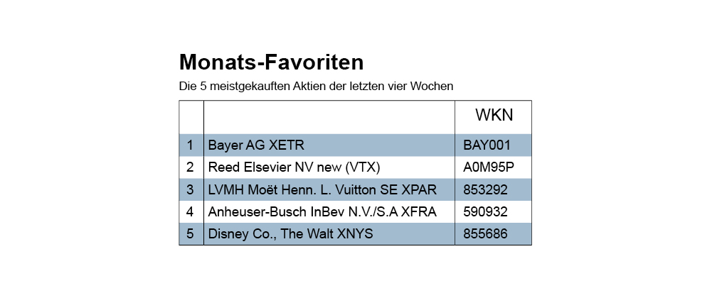 Wie schon öfters erwähnt rekrutieren sich viele 1-Monats-Favoriten-Aktien aus einem erweiterten Favoritenkreis. Teilweise erscheinen diese gefragten Titel dann auch im 3-Monats-Ranking. Nur, dort müssen sie mit anderen Wertpapiersorten konkurrieren. Das langfristige Favoritenuniversum unserer Verwaltungen spricht für Spezialisierung auf ausgesuchte Papiere. Dazu gehört auch die Aktie des Bierriesen Anheuser-Busch InBev. Käufe in der Berichtswoche durch verschiedene Verwaltungen hievten den Titel wieder einmal in unsere Favoritenliste.
