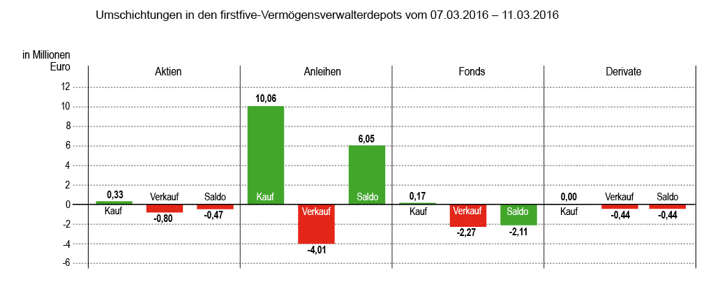 Die Käufe beschränkten sich im Wesentlichen auf Anleihen, die Verkäufe auf Anleihen und – mit einigem Abstand – auf Fonds. Zwar fielen verkaufsseitig auch europäische Aktien auf, aber vor allem durch die höhere Zahl der Transaktionen im Vergleich mit den Käufen. Welche Märkte wurden präferiert? Bei Renten waren mehr Unternehmensanleihen als Staatsanleihen gefragt. In der Vorwoche war es noch anders herum. Die Festverzinslichen wurden schwerpunktmäßig aus einem europäischen „Universum“ ausgewählt. Mit dem Bond eines mexikanischen Ölunternehmens brachte sich aber auch ein Schwellenlandpapier prominent in Stellung, da es sich ganz oben im first-five-Ranking der Käufe positionieren konnte. Verkaufsseitig beschränkten sich die Entscheider auf europäische Unternehmensanleihen. Auch bei den abgegebenen Fonds war Europa bzw. Deutschland übergewichtet.
