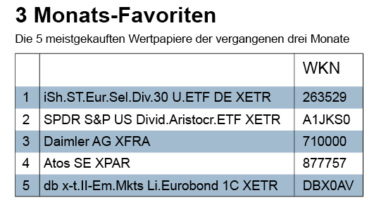 Keinem „neuen“ Wertpapier gelang in der Berichtswoche der Einzug ins 3-Monatsranking. Nach wie vor sind Strategie– bzw. Dividenden-ETFs vorne. Das ist Ausdruck der Tendenz der letzten Wochen. Der erstplatzierte ETF wurde in der Berichtswoche abermals nachgefragt und er war nicht der einzige seiner Kategorie: Der Trend der letzten Zeit, in Smart-Beta-ETFs anzulegen, scheint sich also weiter fortzusetzen, wobei es sich allerdings nur um eine beschränkte Zahl von Produkten handelt, die immer wieder in den Kauflisten erscheinen.