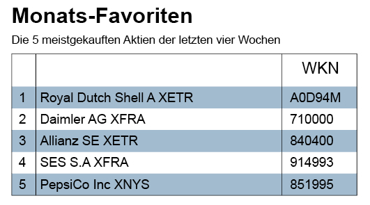 Aktien des britischen Energieunternehmens Royal Dutch Shell wurden in der Berichtswoche von einer Vermögensverwaltung mehrfach zugekauft. Das ist der Grund, weshalb das Papier nun ganz oben steht in der firstfive-Aktien-Favoritenliste und weshalb es zudem auch noch in unseren Topkauf-Rankings erscheint. Es bleibt abzuwarten, ob es sich dabei nur um eine „Ein-Wochen-Fliege“ handelt.