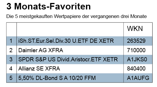 Bei den Aktien waren in der Berichtswoche wieder europäische Langzeitfavoriten gefragt, etwa Allianz, Sanofi, Atlas Copco, Daimler, auch Henkel, zudem wieder einige nordamerikanische Titel, etwa Apple oder Northrop Grumman. Abgegeben wurden gleichfalls Daimler-Papiere und auch einige Briten. Bei den Festverzinslichen stehen Unternehmens– und Staatsanleihen auf den Kauf– (Südafrika) und Verkaufslisten (Belgien, Italien, Deutschland).
