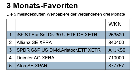 Der Umsatz von 26,5 Mio. Euro verteilte sich auf Renten (9,9), Aktien (6,6), Fonds (6,5) und Zertifikate (3,5). In allen Kategorien überragten die Käufe die Verkäufe bei weitem. Aktien wurden auf breiter Front innerhalb des euro-amerikanischen Universums gekauft. Bei den Fonds sehen wir viele ETFs; u.a. waren auch japanische Indizes sowie Schwellenländer gefragt. Auffällig die vielen Investitionen in strukturierte Produkte unterschiedlicher Sorte verschiedener Vermögensverwaltungen, wobei allerdings eine Verwaltung in der Berichtswoche besonders aktiv war.