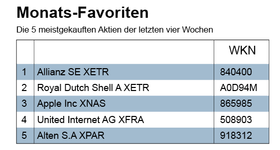Die Aktien des iPhone-Herstellers Apple aus Cupertino in Kalifornien und des Internet-Providers United Internet aus Montabaur in Rheinland-Pfalz sind neu in unser Aktienfavoriten-Ranking gerückt. Auf Apple gingen wir bereits im letzten Newsletter unter „Käufe“ ein. Die Aktie wurde auch in der Berichtswoche wieder gekauft. Das galt auch für das Papier von United Internet, ebenso für die Allianz-Aktie. Im Ranking der Aktienkäufe gemäß Umsatzvolumen reichte es allerdings nur für Allianz (Rang 4) und Apple (5) unter die first five. Ganz vorne steht hier die Aktie von Bpost.