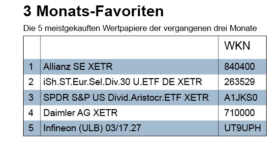 Neben dem Zertifikat, dass die dividendenstärksten Titel aus dem S&P500 abbildet, hat sich in dieser Woche auch der börsengehandelte Fonds von Black Rock, der auch besonders dividendenstarke Titel enthält, in der Favoritenliste festgesetzt. Auf onvista.de heißt es zu dem Fonds: „Primäres Ziel des iShares DJ STOXX Select Dividend 30 (DE) ist eine möglichst exakte Nachbildung des Dow Jones STOXX Select Dividend 30 (Preisindex) der STOXX Limited. Die Dividendenerträge werden im Fonds angesammelt und bis zu viermal jährlich an die Anteilseigner ausgeschüttet.“ Das Investment zeigt eindrucksvoll: Dividenden sind die neuen Zinsen.