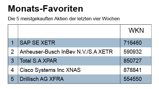 Die Ironie der Geschichte: in der Berichtswoche wurde in den erstplatzierten Gold-ETC nicht nur nicht investiert, sondern er befindet sich auch noch ganz oben auf der Rangliste der Top-Verkäufe. Weil Verkäufe jedoch zu keinen Abzügen bei den Drei-Monats-Favoriten führen, fiel die Allianzaktie zeitbedingt (Käufe fielen aus dem Drei-Monats-Fenster heraus) einen Rang zurück.