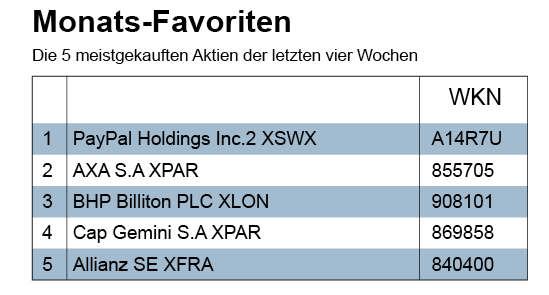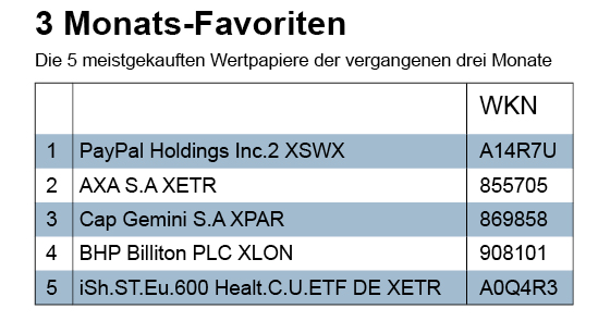 Die Käufe von Billiton-Aktien in der Berichtswoche hievten das Papier auch in unser 3-Monatsranking der meistgekauften Wertpapiere, wobei Anteilsscheine des britischen Rohstoffkonzerns ebenso Anfang November und Anfang Oktober gekauft worden sind. Damit sind wir nun Zeuge der äußerst seltenen Situation, dass vier Favoriten unserer Monatsaktienliste zugleich vier Wertpapierfavoriten der letzten drei Monate sind. Und in Anbetracht des Umstandes, dass der aktuell Fünfte im Wertpapierranking ein europäischer Aktien-ETF ist, gilt: Aktien haben auch in diesem Ranking die Herrschaft übernommen.
