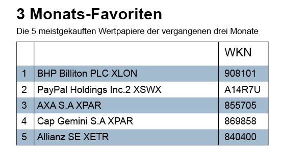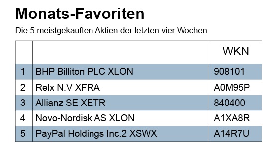 Weil die Umsätze so gering waren, wundert es nicht, dass sich auch an den Favoritenlisten kaum etwas geändert hat. In der Monatsrangliste bleibt BHP Billiton ganz oben. Nur die Allianz tauschte ihren Platz mit Novo-Nordisk.