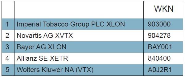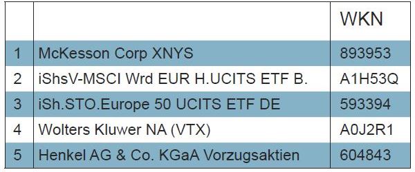 Bei den 3-Monatsfavoriten hat sich gegenüber der Vorwoche wenig verändert. Das Papier von Wolters Kluwer, das bereits des Öfteren in unseren Ranglisten auftauchte, ist für einen Dax-ETF eingerückt. Erhalten geblieben ist die Präponderanz des Aktienmarktes bei den 3-Monatsfavoriten, entweder über Einzeltitel oder über Index-Produkte. Dabei muss allerdings einschränkend erwähnt werden, dass die Position von McKesson auf Käufe im Juli zurückzuführen ist. Jedes der vier anderen Wertpapiere war hingegen auch im September gefragt, zuletzt Henkel.