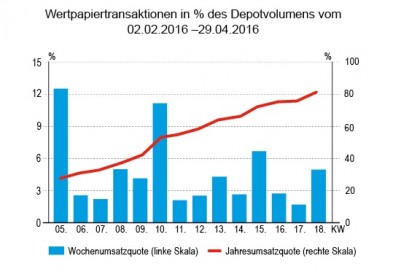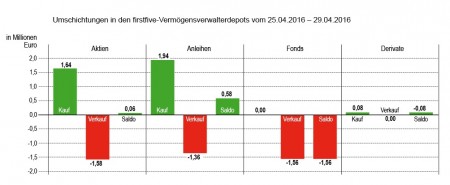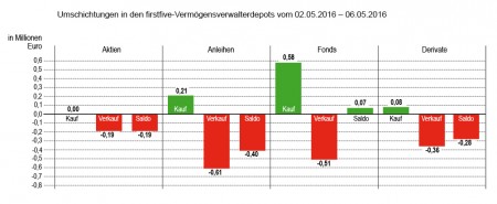 Die in der Berichtswoche eingegangenen Positionen bei Aktien, vorwiegend aus Europa (Deutschland, Schweiz, Frankreich, Belgien, Irland, Italien, um nur einige Länder zu nennen) und den USA, verdanken sich – bis auf eine Transaktion – Käufen in der ersten Hälfte der Berichtswoche.