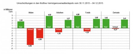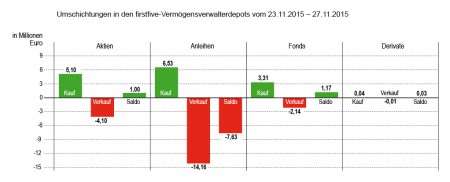 Mit 4,30 Prozent des Depotvolumens und einem Gesamtbetrag von knapp 32 Mio. Euro war der Wochenhandel überaus lebhaft. Die Struktur war auch hier gewissermaßen vorweihnachtlich: die Anleger gaben für Käufe rund doppelt so viel aus wie sie für ihre Verkäufe bekamen.