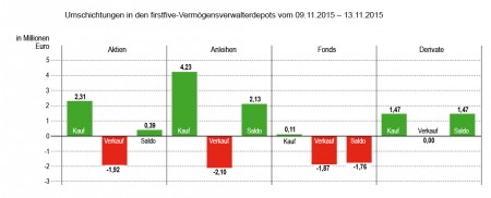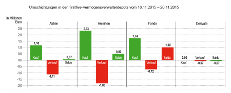 Anders als bei den Käufen waren bei den Verkäufen im Segment der Anleihen die Beträge pro Transaktion zum Teil sehr hoch. Aufgrund dessen und der vielen Veräußerungen im Rentensegment summierte sich der Verkaufsumsatz in dieser Anlageklasse auf über 20 Mio. Euro.