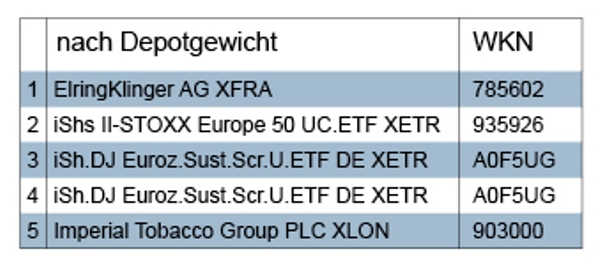 Kommen wir nun zu den Aktien. Auffällig war, dass das Vereinigte Königreich und Irland abermals Favoritenregion bei den Aktien war. Unter anderem wurde in folgende Unternehmen investiert: Imperial Tobacco, die im relativen Ranking fünftplatziert sind – und über die wir bereits im Newsletter der Woche 39 und in der Vorwoche geschrieben haben. Außerdem: Rotork; Prudential; Smith & Nephew; Ryanair, Experian – womit noch nicht alle genannt sind. Unter den deutschen Titeln, die einen weiteren Schwerpunkt bildeten, waren u.a.: Henkel, Merck KGaA, Axel Springer, SAP, Deutsche Post, Deutsche Telekom und Elring Klinger – Führender in unserem first-five-Ranking der Topkäufe gemäß Depotgewicht.