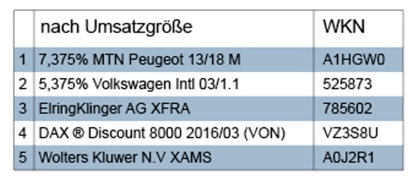 Wenden wir uns zunächst den Anleihen zu, die im Ranking der Topkäufe gemäß Umsatzvolumen auch die ersten beiden Plätze belegen. In der Berichtswoche wurde ausschließlich in Unternehmensanleihen investiert. Präferiert wurden Papiere von Unternehmen der entwickelten westlichen Ökonomien, jedoch lag auch hier, wenn auch nicht ganz so stark wie bei den Aktien, der Schwerpunkt auf Europa. Auffällig die kräftige Nachfrage nach Bonds von Unternehmen der Autoindustrie, darunter u.a. Daimler, BMW. Insofern sind die beiden erstplatzierten Investments in Papiere von Peugeot und VW (International Finance) durchaus typisch für die Bond-Präferenzen in der Berichtswoche.