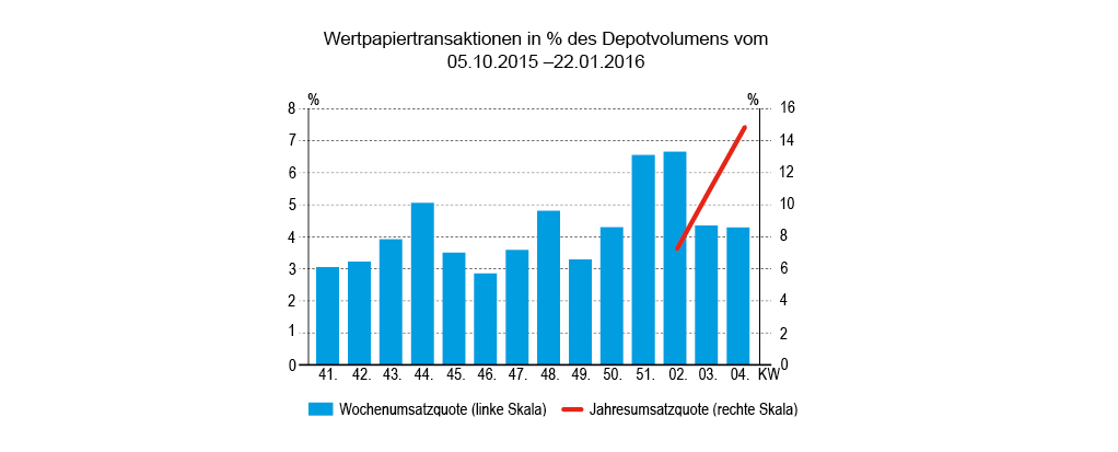 Mit einem Anteil von 4,29 Prozent des gemeldeten Depotvolumens lag der relative Umsatz nur knapp unter dem der Vorwoche. Das absolute Volumen des Handels befand sich mit 32 Mio. Euro zwar im oberen Durchschnittsbereich, es war aber rund 9 Mio. Euro geringer als der entsprechende Betrag in der sehr aktiven Vorwoche. Das bedeutet, dass weniger Verwaltungen gemeldet haben – ob deshalb, weil sie nicht handelten, oder aus anderen Gründen, können wir den nichtübermittelten Daten logischerweise nicht entnehmen.
