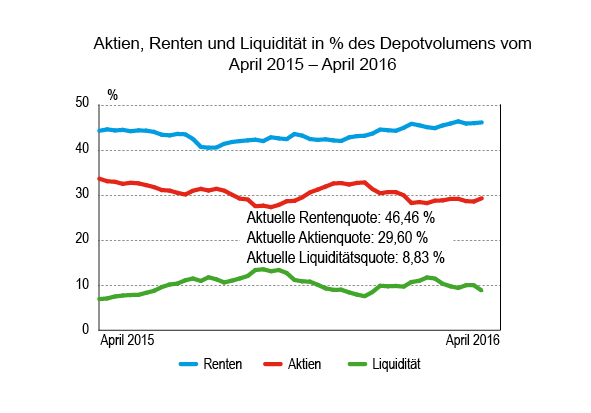 Die steigenden Aktienmärkte machten sich nicht nur beim Umsatz, sondern auch bei der Verteilung der Assetklassen bemerkbar. Der Anteil der Aktien erhöhte sich – insbesondere kursbedingt – von 28,88 auf 29,60 Prozent. Ob es bald gelingen wird, die für unsere Depots in der Gesamtperspektive markante 30-Prozent-Schwelle nicht nur zu übertreffen, sondern dann auch darüber zu bleiben? Gerade den offensiveren Depots würde dies gut tun, befinden sie sich doch noch klar im Minusbereich, was die YTD-Performance anbelangt.
