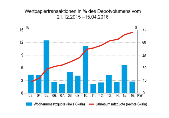 Der eher leicht unterdurchschnittliche prozentuale Umsatz von 2,73% des gemeldeten Depotvolumens entsprach einem absoluten Umsatz von 18,7 Mio. Euro. Die Woche davor hatten wir noch einen sehr viel höheren relativen Umsatz bei geringerem Volumen. Ein Indiz dafür, dass in der Berichtswoche wieder mehr Verwaltungen meldeten bzw. sich am Handel beteiligten, nachdem die Vorwoche noch zu den „Aussitzwochen“ ohne Richtung zählte. In der Berichtswoche stärkten insbesondere steigende Aktienmärkte nach einer Periode der Flaute den Kaufumsatz bei Aktien.