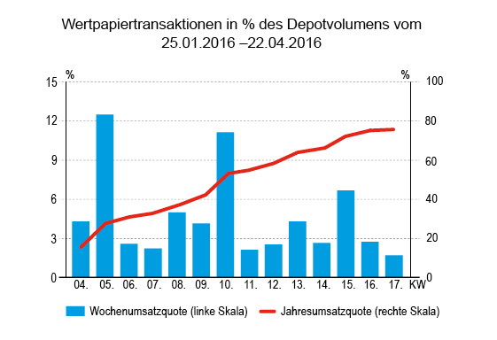Mit einem Anteil von 1,69 Prozent des gemeldeten Depotvolumens und einem Betrag von 9,32 Mio. Euro lag der Umsatz der Berichtswoche vom 18.4. bis 22.4. weit unter dem langfristigen Durchschnitt. Einige Verwaltungen, die sonst zu den „Großhändlern“ zählen, die also zum Umsatz fleißig beitragen, verhielten sich dieses Mal sehr abwartend. Der kumulative prozentuale Jahresumsatz liegt nun, nach mehr als dreieinhalb Monaten bzw. 17 Wochen, bei 75,55 %. Im letzten Jahr wurde die 75-Prozent-Schwelle bereits Mitte März in Woche 11 überschritten, 2014 hingegen erst Ende April in Woche 18.