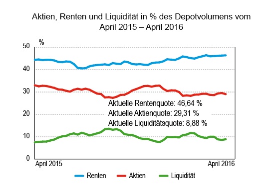Bei der Beobachtung der Entwicklung der Depotanteile wächst die Anleihenquote in den Depots weiter und weiter. Momentan machen Anleihen durchschnittlich mehr als 46 Prozent aus. Darin sind, wohlgemerkt, keine Geldmarktanlagen inbegriffen. Die werden der Liquiditätsquote zugeschlagen. Auch in der Berichtswoche wurden wieder per Saldo Stücke dazugekauft. Es handelt sich, so unsere Gesprächspartner aus der vergangenen Woche, um taktische Käufe. Man will von kurzfristig weiter sinkenden Zinsen profitieren.