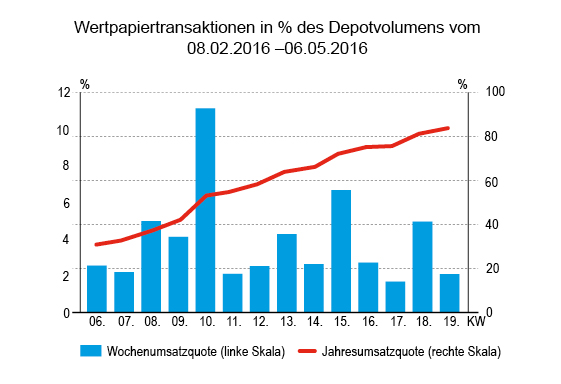 Mit müden 18 Transaktionen, einem Anteil von 2,1 Prozent der gemeldeten Depots und einem Volumen von lediglich 2,57 Mio. Euro lag der Umsatz in der von Feier– und Brückentag verkürzten Dreitages-Berichtswoche im langfristigen Tiefenrekordbereich. Wir hatten dieses Jahr noch keine so schwache Handelswoche.Aber die Vergangenheit lehrt auch, dass auf handelsschwache Wochen meistens handelsstarke Wochen folgen: weil sich manches aufgestaut hat oder weil die Gesamtsituation dazu zwingt oder aber weil die Chancen sehr günstig sind. Hoffen wir für nächste Zeit auf Letzteres.