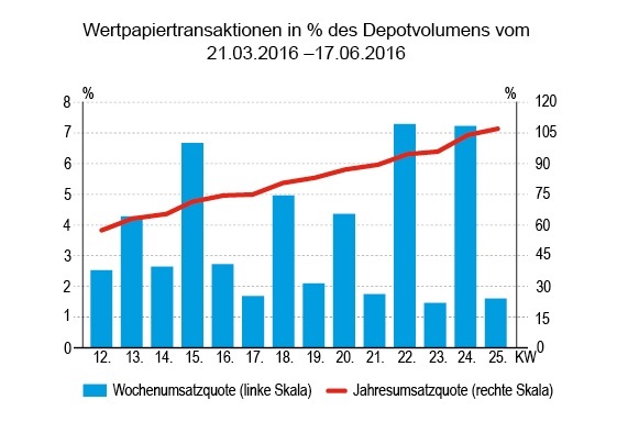 Mit 1,61 Prozent der gemeldeten Depots (und die machten auch nur etwa 0,5 Milliarden Euro aus), war das Umsatzvolumen eines der schwächsten im ganzen Jahr. Und das vor einem Ereignis, dass alle anderen Themen von der Pressemeldungs-Agenda verdrängt hat, dem Brexit. Insgesamt beobachteten wir Transaktionen von nicht einmal sieben Millionen Euro. Auf Aktien und Anleihen entfielen dabei ungefähr fünf Millionen Euro. Zertifikate konnten immerhin noch rund 1,5 Millionen Euro auf sich vereinigen. Der Umsatz verteilte sich allerdings nur auf einige wenige Transaktionen.