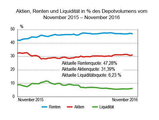 Die Umsatzquote in der Berichtswoche vom 7.11. bis 11.11. 2016 lag mit 4,51 Prozent über dem langfristigen Durchschnitt. Bemerkenswerter ist jedoch, dass das gemeldete Depotvolumen, auf das sich die Umsatzquote bezieht, deutlich höher war als sonst. Es lag in der Berichtswoche nur knapp unter einer Milliarde Euro. Dementsprechend war das Umsatzvolumen mit 42,81 Mio. Euro so hoch wie selten. Insgesamt wurden uns 227 Transaktionen während der Berichtswoche gemeldet, davon waren 103 Käufe und 124 Verkäufe.