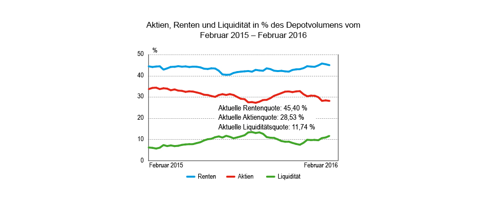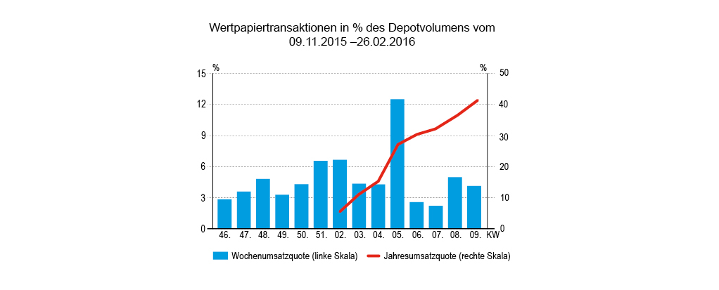 Zwar wurden 4,14 Prozent des gemeldeten Depotvolumens umgesetzt. Das ist relativ viel. Aber die Betonung liegt auf „relativ“. Denn es meldeten etliche Verwaltungen nicht, so dass das von uns erfasste Umsatzvolumen lediglich bei 10,3 Mio. Euro lag. Alles in allem näherte sich auf dieser Datengrundlage der Handel in der Berichtswoche quantitativ wie auch strukturell dem der Vorvorwoche (8.2. – 12.2.) an. Also: kaum Käufe, sieht man von Anleihen ab; starker Verkaufsüberhang generell und dies speziell bei Aktien und Fonds.