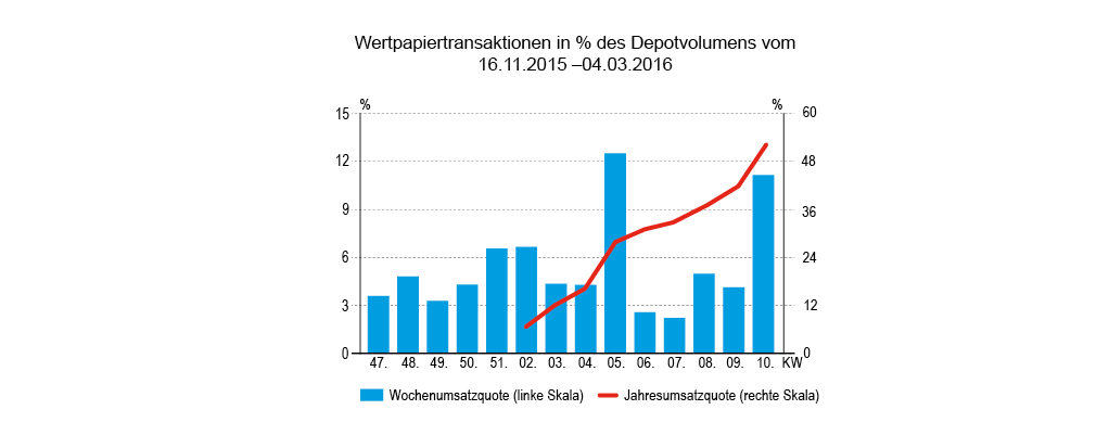 Das Handelsvolumen war mit 28,54 Mio. Euro sehr ordentlich. Berücksichtigt man den relativen Anteil des Umsatzes von 11,15% des uns von den Verwaltungen gemeldeten Depotvolumens, dann lag der Umsatz in der Berichtswoche weit über dem langfristigen Durchschnitt. Offensichtlich stimulierten steigende Märkte die Kauflaune bei Aktien und Fonds, die in den letzten Wochen von den Verwaltern des öfteren zu „Ladenhütern“ degradiert wurden. Zugleich ragten, wie in den Vorwochen, Kauf und Handel bei Anleihen heraus.
