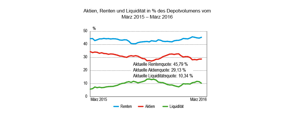 Gebremst gilt für zwei Aspekte. Erstens war der relative Umsatz mit 2,11 Prozent des gemeldeten Depotvolumens sehr verhalten. In den drei Wochen zuvor lag dieser Umsatzwert im oberen Durchschnitt oder darüber. Aber den Wechsel von mehrwöchiger relativer Aktivität und (einwöchiger) Zurückhaltung beobachteten wir bereits im Januar dieses Jahres. Die zweite „Bremsspur“ in unseren Datensätzen ist der Umstand, dass die Woche von defensiven Investments bestimmt war: Anleihen, Anleihen und nochmals Anleihen, nur wenige Aktien und gerade einmal ein Fonds auf der Kaufseite.